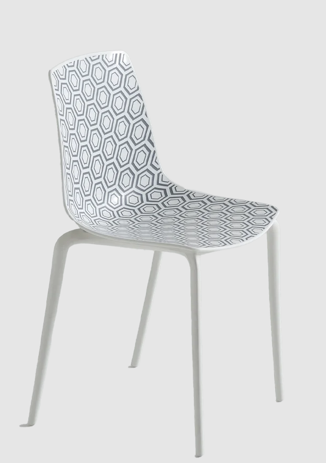 Alhambra to krzesło, które łączy nowoczesny design z subtelną grą formy i faktury. Siedzisko z tworzywa o wyjątkowej, geometrycznej teksturze sześciokątów przyciąga wzrok i nadaje wnętrzom unikalny charakter. Paleta barw pozwala na tworzenie zarówno spójnych, stonowanych aranżacji, jak i odważnych, kolorowych kompozycji. Smukła podstawa z tworzywa jest przystosowana do użytku zewnętrznego, zachowując elegancję nawet w wymagających warunkach.