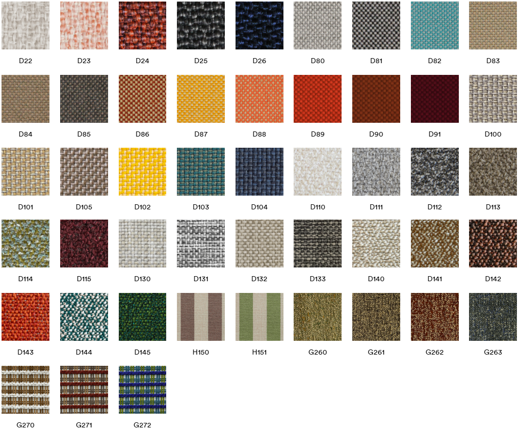 Tapicerowane siedzisko krzesła dostępne jest w poniższych wariantach tkanin odpornych na warunki atmosferyczne.