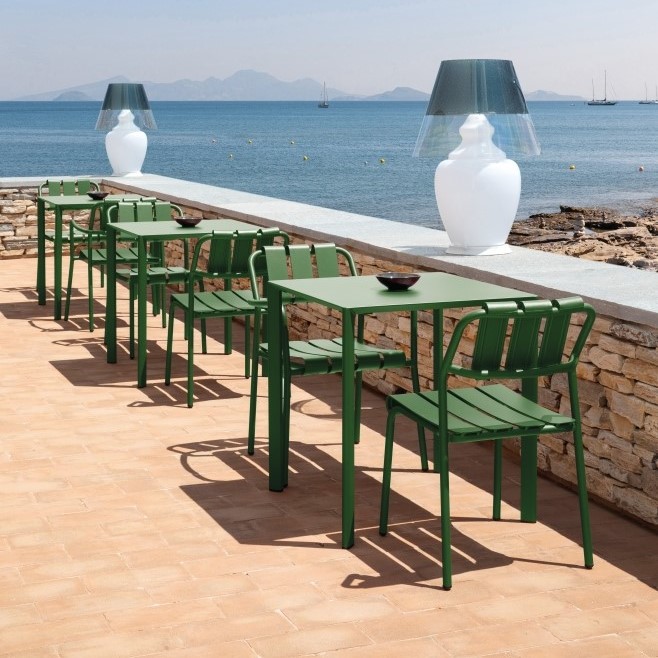 Verdea to uniwersalne krzesło ogrodowe od włoskiego producenta Vermobil, stworzone z myślą o trwałości i estetyce. Solidne aluminium stanowi zarówno mocny, jak i lekki materiał, odporny na deszcz, słońce oraz zmienne temperatury. Prosta, a jednocześnie wyrazista forma zbudowana z szerokich aluminiowych pasów wprowadza do aranżacji nowoczesną lekkość. Model jest w pełni sztaplowany, co czyni go bardzo praktycznym rozwiązaniem w restauracjach, kawiarniach czy ogrodach prywatnych. Dostępność wielu kolorów pozwala na tworzenie spójnych lub kontrastowych zestawów — w zależności od potrzeb projektu.