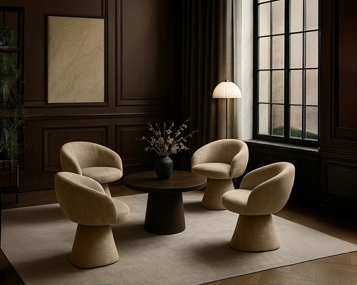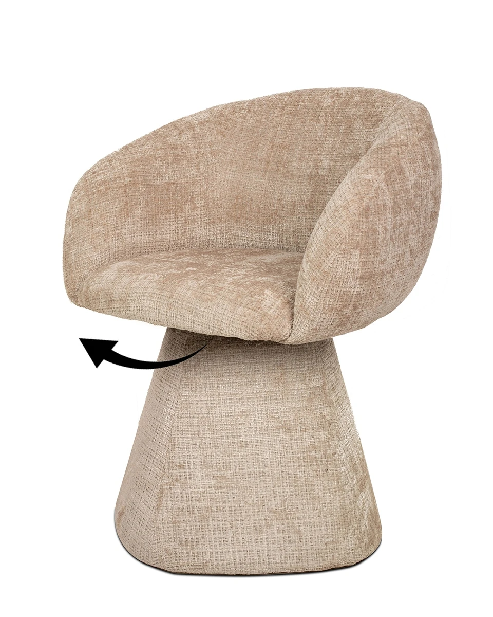 Krzesło wyposażono w funkcję obrotu z mechanizmem autopowrotu, dzięki czemu siedzisko zawsze wraca do pozycji wyjściowej, co ułatwia utrzymanie porządku i estetyki wnętrza. Pedra doskonale sprawdzi się w salonie, eleganckim lobby lub przestrzeni komercyjnej, stając się stylowym i praktycznym akcentem wnętrza.