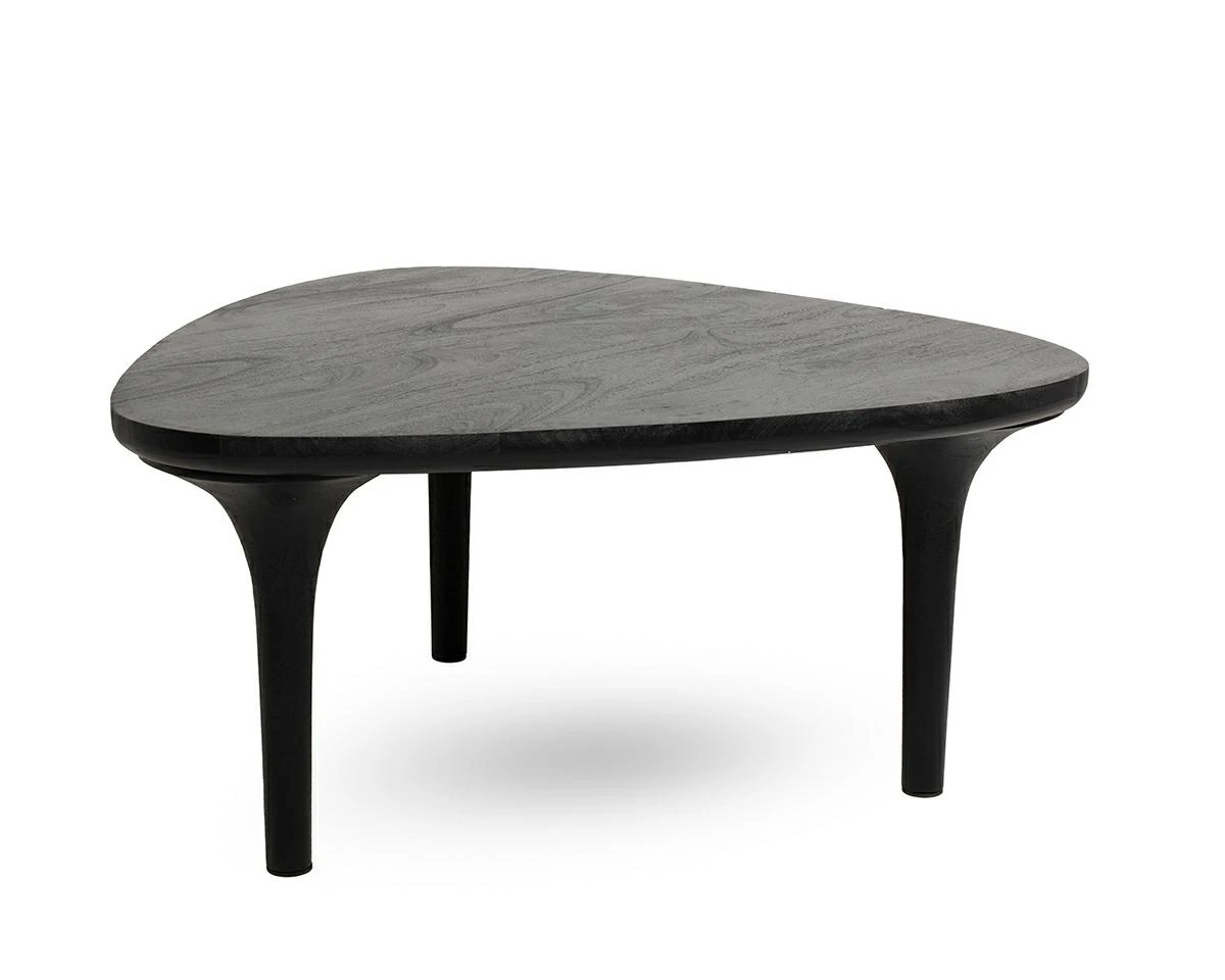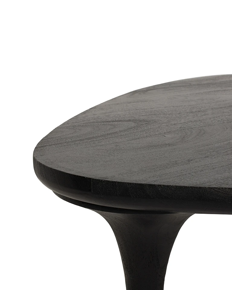 Wykonany z litego drewna mango i wykończony elegancką czernią, zachwyca subtelną asymetrią i delikatnie zaokrąglonymi liniami. Smukła podstawa i organiczny kształt blatu nadają stolikowi lekkości, dzięki czemu doskonale komponuje się zarówno w nowoczesnych, jak i eklektycznych wnętrzach.