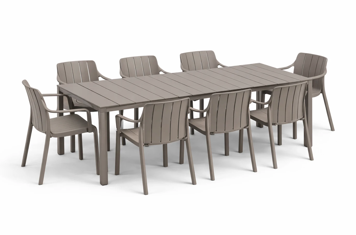 Kompletny zestaw obejmujący stół Rio oraz 8 krzeseł Tiberina stanowi funkcjonalne i estetyczne rozwiązanie dla wymagających użytkowników. Stół Rio wykonany został z powlekanego aluminium najwyższej jakości, dzięki czemu charakteryzuje się dużą wytrzymałością, stabilnością oraz odpornością na długotrwałe użytkowanie. To mebel zaprojektowany z myślą o wieloletniej eksploatacji.